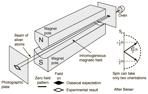 Stern-Gerlach ExperimentIn 1921, Otto Stern and Walter Gerlach performed an experiment which showed the quantization of electron spin into two orientations. This made a major contribution to the development of the quantum theory of the atom. The actual experiment was carried out with a beam of silver atoms from a hot oven because they could be readily detected using a photographic emulsion. The silver atoms allowed Stern and Gerlach to study the magnetic properties of a single electron because these atoms have a single outer electron which moves in the Coulomb potential caused by the 47 protons of the nucleus shielded by the 46 inner electrons. Since this electron has zero orbital angular momentum (orbital quantum number l=0), one would expect there to be no interaction with an external magnetic field. Stern and Gerlach directed the beam of silver atoms into a region of nonuniform magnetic field (see experiment sketch). A magnetic dipole moment will experience a force proportional to the field gradient since the two "poles" will be subject to different fields. Classically one would expect all possible orientations of the dipoles so that a continuous smear would be produced on the photographic plate, but they found that the field separated the beam into two distinct parts, indicating just two possible orientations of the magnetic moment of the electron. But how does the electron obtain a magnetic moment if it has zero angular momentum and therefore produces no "current loop" to produce a magnetic moment? In 1925, Samuel A. Goudsmit and George E. Uhlenbeck postulated that the electron had an intrinsic angular momentum, independent of its orbital characteristics. In classical terms, a ball of charge could have a magnetic moment if it were spinning such that the charge at the edges produced an effective current loop. This kind of reasoning led to the use of "electron spin" to describe the intrinsic angular momentum. |