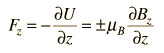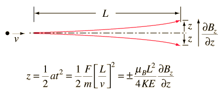 Stern-Gerlach Experiment![]() This experiment confirmed the quantization of electron spin into two orientations. This made a major contribution to the development of the quantum theory of the atom. The potential energy of the electron spin magnetic moment in a magnetic field applied in the z direction is given by ![]() where g is the electron spin g-factor and mB is the Bohr magneton. Using the relationship of force to potential energy gives ![]() The deflection can be shown to be proportional to the spin and to the magnitude of the magnetic field gradient. ![]()
