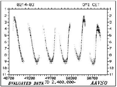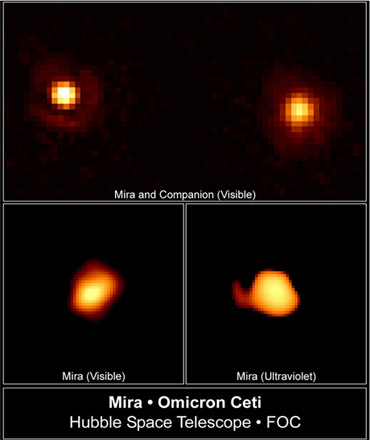 Mira is a binary system with separation about 70 times more than that between Earth and the Sun, (equal to an angular size of only 0.6 arcseconds -- the apparent diameter of a dime at four miles away). It is the prototype for an entire class of stars known as "Mira-type variables." Although once like our Sun, Mira is now at the end of its life, and has evolved into a cool red giant star that is highly variable in brightness. Contracting and expanding every 332 days, Mira sheds vast amounts of material through its powerful "wind" of gas and dust. The orbital period of the companion star is about 400 years. (NASA) The top image above is a NASA Hubble Space Telescope image of the cool red giant star Mira A (right) and its binary companion taken on December 11, 1995 in visible light using the European Space Agency's Faint Object Camera (FOC). At bottom left isHubble's visible-light image of the disk of Mira, revealing an odd, asymmetrical shape resembling a football. This may be tied to dramatic changes occurring during its expansion-contraction cycles, or to the presence of unresolved spots on its surface. Hubble measurements show the red giant star is 700 times larger than our Sun. The lower right image is made in UV light. Hubble resolves a small hook-like appendage extending from Mira, in the direction of the companion that could be material from Mira being gravitationally drawn toward the smaller star. Alternately, it could be that material in Mira's upper atmosphere is being heated due to the companion's presence. PHOTO CREDIT: Margarita Karovska (Harvard-Smithsonian Center for Astrophysics), and NASA If Mira were at the center of our solar system, it would extend out more than 300 million miles, well beyond Mars' orbit and nearly two-thirds of the way to Jupiter. Mira's companion is a white dwarf that is surrounded by material captured from Mira's wind. At a distance of about 400 light-years, Mira is the closest wind-accreting binary system to Earth. "Mira is the brightest and most famous long-period pulsating variable in the sky, and gave the name to this whole class of stars. It changes its brightness normally between maxima of about 3rd magnitude and minima of about mag 10, but occasionally brighter maxima up to mag 2.0 are observed (e.g. by William Herschel), or fainter when Mira stays at about magnitude 5. At a distance of about 400 light years, this corresponds to absolute magnitudes of about -2.5 near the maxima and +4.7 near its minima, so giant cool Mira is only about as, or even less luminous than our sun near its minima, but brightens up to about 700 and occasionally even over 1500 solar luminosities near the maximum of its cycle."(seds.org). A whole class of variable stars have been named after Mira. "Mira-type" stars are variables with a period of around 100 - 1000 days and with visual light variations of more than 2.5 magnitudes. Over 6000 "Mira variables" are now known.