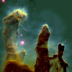 Areas in space which are luminous with the emission spectrum of ionized hydrogen are called H II regions. They are associated with the presence of massive O-type and B-type stars. Such stars, having surface temperatures in the range 15,000 - 30,000K, have characteristic blackbody radiation curves which peak in the ultraviolet. These stars will often be surrounded by vast clouds of hydrogen gas, and the uv can ionize the hydrogen atoms. These hydrogen atoms tend to attract electrons and reassemble, with the captured electrons cascading down through the quantum states of the hydrogen atom, emitting characteristic photons of light upon each downward jump. A characteristic visible color from such emission is red light at 656 nm associated with the n=3 to n=2 transition which is called H-alpha. Depending upon the recession velocity of the nebula, the light will be red-shifted, but many regions like the M16 region show a red glow characteristic of the hydrogen emissions. H II regions are associated with young star clusters, and are useful as a part of astronomical distance measurement.
