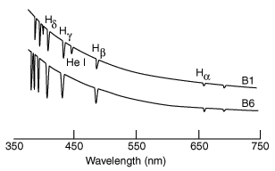 B-Type StarsBlue-white stars with surface temperatures of about 15000K. The ionized helium (HeII) lines of the O-type stars have disappeared and neutral helium (HeI) lines are strongest at B2. The neutral hydrogen (HI) lines are getting stronger and singly ionized OII, SiII and Mg II are visible. A significant rise of the blackbody spectrum toward the blue is still evident. ![]() These are sketches of spectra in Kaufmann. The original data are attributed to G. Jacoby, D. Hunter and C. Christian.