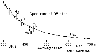 O-Type StarsIncluded are blue stars with surface temperatures of 20,000 to 35,000K. The thermal energy is so great at these temperatures that most surface hydrogen is completely ionized so hydrogen (HI) lines are weak. Unionized helium (HeI) is visible but the stronger spectra are of mulitple ionized atoms (HeII, CIII, NIII,OIII,SiV). Note the rise of the spectral curve toward the blue from the blackbody radiation curve.