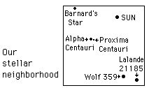 If our sun, which has diameter 1.392 x 109 meters were scaled down to the size of a period on a printed page, which is nominally about 0.5 mm, then the distance to Alpha Centauri would be about 13.6 km or about 8 miles away. If the Earth were scaled to 0.5 mm diameter, then the Sun would be a ball of diameter 5.4 cm ( a little smaller than a tennis ball) at a distance of 5.9 m (19 ft). On this scale, Alpha Centauri would be 1.48 x 106 meters or about 890 miles away. If the sun were scaled to a 1 foot radius, then Alpha Centauri would be about 10,300 miles away. The parallax of Proxima Centauri as the Earth orbits the sun is about equivalent to that of a dime at a distance of 6 kilometers. There are 40 stars within 16 light years of the Earth. Ward & Brownlee comment that in the same space in a globular cluster, there might be 1000 or more. "The M15 globular cluster has some 30,000 stars packed into a space only 28 light-years across." |