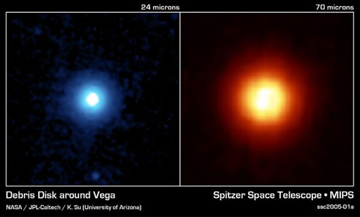 "14,000 years ago, Vega, not Polaris, was the north star. Vega is the fifth brightest star in the night sky, and has a diameter almost three times that of our Sun." (NASA) It is 60 times brighter than the Sun, and is projected to have a lifetime of about 350 million years, or 1/13 the lifetiime of the Sun. ![]() Images made by the Spitzer Space Telescope give details about the large dust cloud surrounding Vega. This massive amount of debris is thought to be the result of a collision of perhaps Pluto sized objects. This dust is being blown away by the intense light of the star, so the collision is likely to have occurred within the last million years. The massive dust disk extends to at least 815 astronomical units, or about 20 times the size of our solar system. Sources |