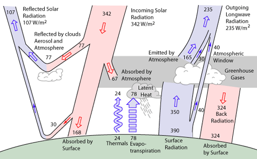 Earth's Energy Balance![]() This graphic was modeled after Kiehl and Trenberth's estimate of the Earth's annual global mean energy budget. Note that the mean incident power per square meter is 342 watts, and that for thermal equilibrium the reradiated power must also be 342 watts/m2. Kiehl & Trenberth's division of that re-radiated power is 107 watts/m2 of reflected sunlight and 235 watts/m2 of long wavelength radiation (infrared).