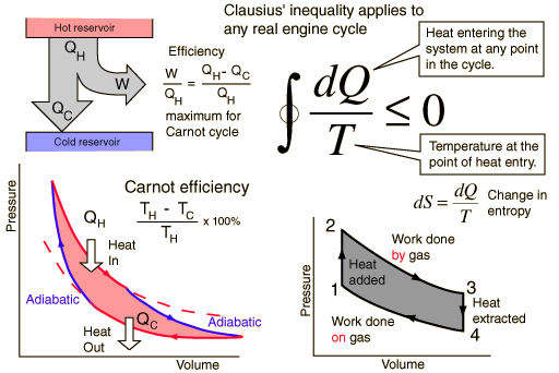 The Clausius Theorem and Inequality![]() The equality above represents the Clausius Theorem and applies only the the ideal or Carnot cycle. Since the integral represents the net change in entropy in one complete cycle, it attributes a zero entropy change to the most efficient engine cycle. The Clausius Inequality applies to any real engine cycle and implies a negative change in entropy on the cycle. That is, the entropy given to the environment during the cycle is larger than the entropy transferred to the engine by heat from the hot reservoir. In the simplified heat engine where the heat QH is all added at temperature TH, then an amount of entropy ΔS = QH/TH is added to the system and must be removed to the environment to complete the cycle. In general, the engine temperature will be less than TH for at least part of the time when heat is being added, and any temperature difference implies an irreversible process. Excess entropy is created in any irreversible process, and therefore more heat must be dumped to the cold reservoir to get rid of this entropy. This leaves less energy to do work.