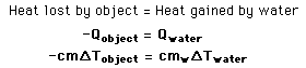 Cooling a Hot ObjectThe cooling of a hot object, say in a container of water, is an example of an approach to thermal equilibrium. The amount of cooling depends upon the masses, specific heats, and original temperatures of the objects. In this example, the possibility of vaporization of the water is neglected , which is unrealistic if the temperature of the hot object is well above 100 C. |