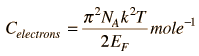 Electron Specific HeatUsing Fermi-Dirac statistics (as opposed to Einstein-Bose for phonons), a small fraction of the electrons are available to participate in specific heat. This fraction contributes a specific heat: ![]() It is important only for low temperatures in metals where it becomes larger than the T-cubed dependent phonon contribution. At those low temperatures is becomes part of the Einstein-Debye specific heat expression.