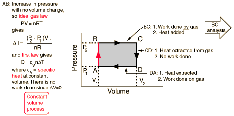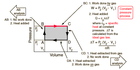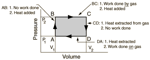Engine CyclesFor a constant mass of gas, the operation of a heat engine is a repeating cycle and its PV diagram will be a closed figure. The idea of an engine cycle is illustrated below for one of the simplest kinds of cycles. If the cycle is operated clockwise on the diagram, the engine uses heat to do net work. If operated counterclockwise, it uses work to transport heat and is therefore acting as a refrigerator or a heat pump. ![]()