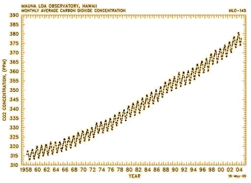 Increase in Greenhouse GasesThe increase in the concentration of carbon dioxide, one of the three major atmospheric contributers to the greenhouse effect has been carefully documented at the Mauna Loa Observatory in Hawaii. The 1990 rate of increase was about 0.4% per year. The interesting cyclic variations represent the reduction in carbon dioxide by photosynthesis during the growing season in the northern hemisphere. Current analysis suggests that the combustion of fossil fuels is a major contributer to the increase in the carbon dioxide concentration, such contributions being 2 to 5 times the effect of deforestation (Kraushaar & Ristinen). Increase in Atmospheric Carbon Dioxide![]() The Mauna Loa monitoring station reports the carbon dioxide level in the atmosphere today as about 380 parts per million compared to 315 ppm in 1958 when modern measurements were initiated. Measurements of air bubbles trapped in the Greenland ice sheet indicate concentrations of 270 ppm in preindustrial times.