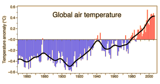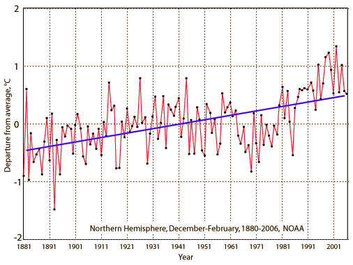 Global WarmingAn issue of major concern is the possible effect of the burning of fossil fuels and other contributers to the increase of carbon dioxide in the atmosphere. The action of carbon dioxide and other greenhouse gases in trapping infrared radiation is called the greenhouse effect. It may measurably increase the overall average temperature of the Earth, which could have disastrous consequences. Sometimes the effects of the greenhouse effect are stated in terms of the albedo of the Earth, the overall average reflection coefficient. ![]() This graphic of the global air temperature was posted by Phil Jones on behalf of the Climatic Research Unit, UK. The key reference used was Brohan, et al. Another depiction of the mean temperatures in the northern hemisphere was drawn from NOAA. ![]() Essentially any kind of tabulation you access will tell the same story. The temperature has gradually risen over the last 150 years. ![]() Because the potential consequences of global warming in terms of loss of snow cover, sea level rise, change in weather patterns, etc are so great, it is a major societal concern. On the other hand, proposed measures to reduce human contributions to greenhouse gases can also have great consequences. The large potential impact combined with the ambiguities of the science has given rise to many passionate extremes. Stephen Schneider of Stanford seems to me to be one of the more balanced voices. His website is a good source for relevant data. He discusses the problems in the context of the Earth's energy balance and the changes in the concentrations of greenhouse gases.