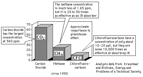 Contributers to Greenhouse EffectThose gas molecules in the Earth's atmosphere with three or more atoms are called "greenhouse gases" because they can capture outgoing infrared energy from the Earth, thereby warming the planet. The greenhouse gases include water vapor with three atoms (H2O), ozone (O3), carbon dioxide (CO2), and methane (CH4). Also, trace quantities of chloro-fluoro-carbons (CFC's) can have a disproportionately large effect. ![]() To attempt to quantify the effects of greenhouse gases on the global temperature, climatologists use the "radiative forcing" of the current atmospheric content of these gases.