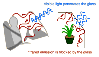 Greenhouse EffectThe greenhouse effect refers to circumstances where the short wavelengths of visible light from the sun pass through a transparent medium and are absorbed, but the longer wavelengths of the infrared re-radiation from the heated objects are unable to pass through that medium. The trapping of the long wavelength radiation leads to more heating and a higher resultant temperature. Besides the heating of an automobile by sunlight through the windshield and the namesake example of heating the greenhouse by sunlight passing through sealed, transparent windows, the greenhouse effect has been widely used to describe the trapping of excess heat by the rising concentration of carbon dioxide in the atmosphere. The carbon dioxide strongly absorbs infrared and does not allow as much of it to escape into space.