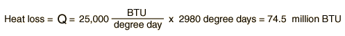 The range of loss rates biven by DOE for uninsulated typical dwellings is 15,000 to 30,000 BTU/degree-day. Choosing 25,000 BTU/degree-day: