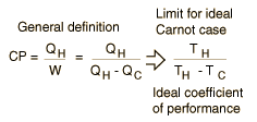 The coefficient of performance (CP) for a heat pump is the ratio of the energy transferred for heating to the input electric energy used in the process. In reference to the standard heat engine illustration, the coefficient is defined by