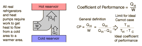 A heat pump is a device which applies external work to extract an amount of heat QC from a cold reservoir and delivers heat QH to a hot reservoir. A heat pump is subject to the same limitations from the second law of thermodynamics as any other heat engine and therefore a maximum efficiency can be calculated from the Carnot cycle. Heat Pumps are usually characterized by a coefficient of performance which is the number of units of energy delivered to the hot reservoir per unit work input.
