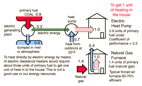 The electric heat pump can overcome the thermal bottleneck imposed by the second law of thermodynamics for the purpose of heating a house. As the illustration shows, an electric heat pump can deliver more heat to a house than burning the primary fuel at 100% efficiency inside the house. That is higher efficiency than a typical forced-air natural gas furnace which brings the primary fuel to the house. This comparison is not quite fair to the natural gas, however, since you can purchase natural gas furnaces which deliver the gas energy into heating at over 90% efficiency.