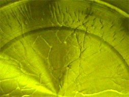 | Convection cells are visible in the heated cooking oil in the pot at left. Heating the oil produces changes in the index of refraction of the oil, making the cell boundaries visible. Circulation patterns form, and presumably the wall-like structures visible are the boundaries between the circulation patterns.