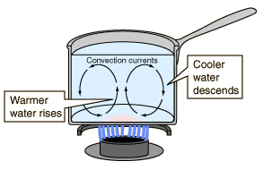 | Convection can also lead to circulation in a liquid, as in the heating of a pot of water over a flame. Heated water expands and becomes more buoyant. Cooler, more dense water near the surface descends and patterns of circulation can be formed, though they will not be as regular as suggested in the drawing.