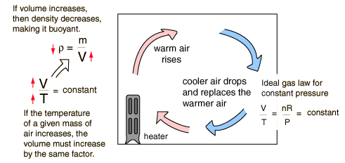 because hot air expands, becomes less dense, and rises (see Ideal Gas Law). Hot water is likewise less dense than cold water and rises, causing
