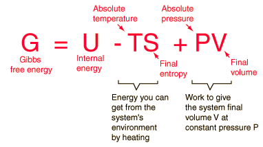 Gibbs Free EnergyFour quantities called "thermodynamic potentials" are useful in the chemical thermodynamics of reactions and non-cyclic processes. They are internal energy, the enthalpy, the Helmholtz free energy and the Gibbs free energy. The Gibbs free energy G is defined by ![]() The internal energy U might be thought of as the energy required to create a system in the absence of changes in temperature or volume. But as discussed in defining enthalpy, an additional amount of work PV must be done if the system is created from a very small volume in order to "create room" for the system. As discussed in defining the Helmholtz free energy, an environment at constant temperature T will contribute an amount TS to the system, reducing the overall investment necessary for creating the system. This net energy contribution for a system created in environment temperature T from a negligible initial volume is the Gibbs free energy. The change in Gibbs free energy, ΔG, in a reaction is a very useful parameter. It can be thought of as the maximum amount of work obtainable from a reaction. For example, in the oxidation of glucose, the change in Gibbs free energy is ΔG = 686 kcal = 2870 kJ. This reaction is the main energy reaction in living cells.