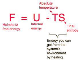 Helmholtz Free EnergyFour quantities called "thermodynamic potentials" are useful in the chemical thermodynamics of reactions and non-cyclic processes. They are internal energy, the enthalpy, the Helmholtz free energy and the Gibbs free energy. The Helmholtz free energy F is defined by ![]() The internal energy U might be thought of as the energy required to create a system in the absence of changes in temperature or volume. But if the system is created in an environment of temperature T, then some of the energy can be obtained by spontaneous heat transfer from the environment to the system. The amount of this spontaneous energy transfer is TS where S is the final entropy of the system. In that case, you don't have to put in as much energy. Note that if a more disordered (higher entropy) final state is created, less work is required to create the system. The Helmholtz free energy is then a measure of the amount of energy you have to put in to create a system once the spontaneous energy transfer to the sytem from the environment is accounted for.