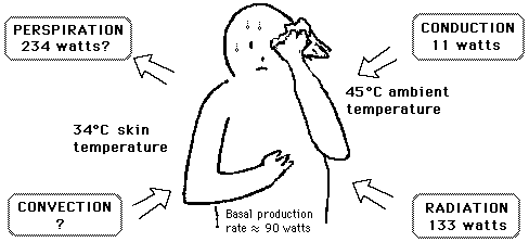 Cooling on very hot day?![]() The standard heat transfer mechanisms act against you, transferring heat into your body on a very hot day. The main cooling mechanism you have available is the evaporation of perspiration. Fortunately, it is a very effective mechanism because of the large heat of vaporization of water. Note that you must continue to have a net outflow of about 90 watts, even on a hot day.