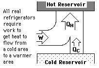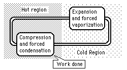 Heat Flow to Hotter RegionAlthough internal energy will not spontaneously flow from a hot region to a cold region, it can be forced to do so by doing work on the system. Refrigerators and heat pumps are examples of heat engines which cause energy to be transferred from a cold area to a hot area. Usually this is done with the aid of a phase change, i.e., a refrigerant liquid is forced to evaporate and extract energy from the cold area. Then it is compressed and forced to condense in the hot area, dumping its heat of vaporization into the hot area.