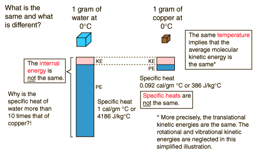 Internal Energy Example![]() When the sample of water and copper are both heated by 1°C, the addition to the kinetic energy is the same, since that is what temperature measures. But to achieve this increase for water, a much larger proportional energy must be added to the potential energy portion of the internal energy. So the total energy required to increase the temperature of the water is much larger, i.e., its specific heat is much larger.