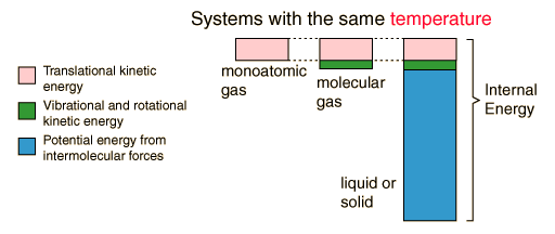 Microscopic EnergyInternal energy involves energy on the microscopic scale. For an ideal monoatomic gas, this is just the translational kinetic energy of the linear motion of the "hard sphere" type atoms , and the behavior of the system is well described by kinetic theory. However, for polyatomic gases there is rotational and vibrational kinetic energy as well. Then in liquids and solids there is potential energy associated with the intermolecular attractive forces. A simplified visualization of the contributions to internal energy can be helpful in understanding phase transitions and other phenomena which involve internal energy. ![]()