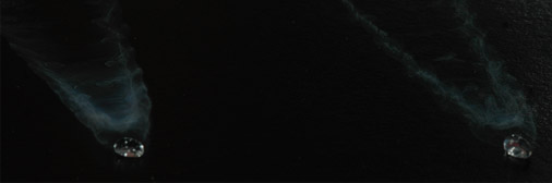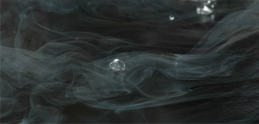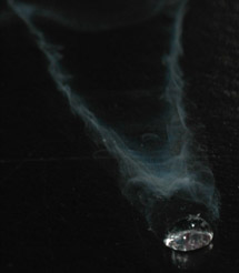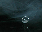 | Droplets on liquid nitrogen on a table top will zip around like tiny hovercraft, suspended on a cushion of nitrogen gas from the rapidly evaporating droplet. The droplets of liquid may also oscillate and rotate rapidly. If placed on a dusty surface, they will pick up dust and carry it with them. |