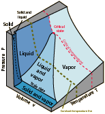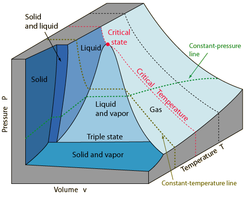 The solid, liquid and gas(vapor) phases can be represented by regions on the surface. Note that there are regions on the surface which represent a single phase, and regions which are combinations of two phases. A point lying on a line between a single-phase and a two-phase region represents a "saturation state". The line between the liquid and the liquid-vapor regions is called the liquid-saturation line and any point on that line represents a saturated-liquid state. A point on the boundary between the vapor and the liquid-vapor regions is called a saturated-vapor state.