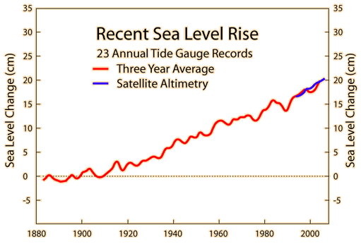 This depiction of recent sea level rise is from Bruce C. Douglas , "Global Sea Rise: A Redetermination". Surveys in Geophysics 18: 279,(1997).