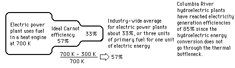 The Thermal BottleneckIf the first law of thermodynamics says you can't win, then the Second Law of Thermodynamics says you can't even break even. The First Law is essentially a statement of conservation of energy and asserts that you can't get more energy out of a heat engine than you put in. But the Second Law says that no heat engine can use all the heat produced by a fuel to do work. The Carnot cycle sets the ideal efficiency which can be obtained if there is no friction, mechanical losses, leakage, etc., but real machine efficiencies are much less. ![]() |