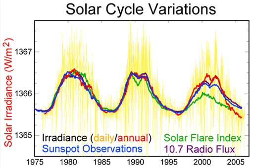 ![]() The above illustration from Wikipedia shows some of the solar measurements as a function of time. The dominant fact from that illustration is that the overall solar output is incredibly constant -- varying only about one part in 1366! But the other variables are measured on a relative scale and represent much larger percentage variations, so it is possible that the solar flare index and the sunspot observations are windows to subtle influences on the Earth's climate that we don't understand. Another solar activity correlation that is being investigated is that with cosmic radiation and its possible effect on cloud nucleation.
