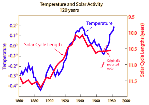 ![]() This illustration is a sketch of data from Durkin, based on data published by Friis-Christensen and Lassen. The end of the solar data has been altered in response to corrections of their data. This correlation between solar activity and temperature has been critiqued by Schneider and others, so it is an active area of investigation. The measured solar activity is well-correlated with the observed temperature variations, but does not follow the recent upturn in temperature as the originally published plot indicated. While it appears that the measured solar cycle length tracks the temperature better than the CO2 concentration for the twentieth century up to 1970, this presented data remains quite controversial. When you look at the climate models that seek to show the human influence past 1970, you do see a good correlation of the temperature with the projected CO2 influence included, while the correlation with solar cycle length weakens.