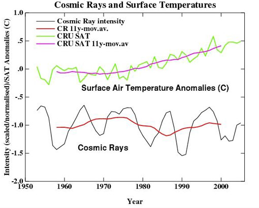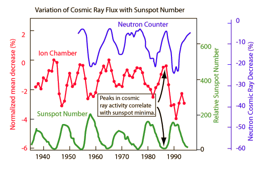 Is Solar Activity Affecting Low Level Cloud Formation?Water vapor is by far the most important greenhouse gas, so small changes in its effectiveness could be important climate drivers. Since it appears that some measure of solar activity other than the relatively constant solar energy output is correlated with changes in global temperature, it has been suggested that solar activity may have some influence on cloud formation. Cloud formation is enhanced when there is some nucleation particle - either a water droplet or a solid particle to act as a nucleus for further condensation (de Pater & Lissauer, Sec 4.4.1). One model suggests that the magnetic activity associated with sunspots modulates the flux of cosmic rays that hits the atmosphere, and that this cosmic ray flux is significant in the nucleation events that promote low level cloud formation. An ionization event by a cosmic ray could leave the nucleation particle charged and enhance its capacity to contribute to droplet formation. If so, then decreased cosmic ray flux implies fewer clouds and therefore higher surface temperature. ![]() This is a sketch of data presented by Svensmark, showing that galactic cosmic radiation is correlated with solar activity as indicated by sunspot number. Svensmark and colleagues also experimented with the effects of cosmic rays on nucleation of aerosols and did demonstrate nucleation events. On the web discussion site Real Climate it is argued that the recent history of cosmic ray activity shows no correlation with the temperature increase. ![]()