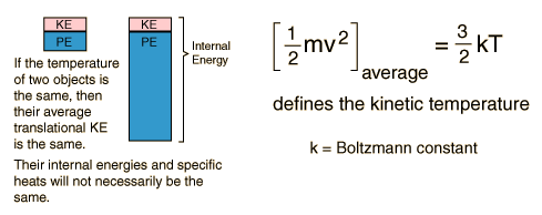 TemperatureA convenient operational definition of temperature is that it is a measure of the average translational kinetic energy associated with the disordered microscopic motion of atoms and molecules. The flow of heat is from a high temperature region toward a lower temperature region. The details of the relationship to molecular motion are described in kinetic theory.The temperature defined from kinetic theory is called the kinetic temperature. Temperature is not directly proportional to internal energy since temperature measures only the kinetic energy part of the internal energy, so two objects with the same temperature do not in general have the same internal energy (see water-metal example). Temperatures are measured in one of the three standard temperature scales (Celsius, Kelvin, and Fahrenheit). ![]()