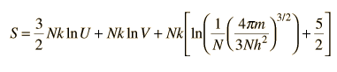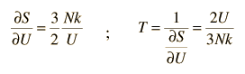 The Relationship of Entropy to TemperatureThe definition of temperature in terms of molecular kinetic energy, the "kinetic temperature", is commonly used in introductory treatments of thermodynamics. But in view of practical difficulties with that approach, temperature is often defined in terms of two other state variables, entropy S and internal energy U. ![]() Temperature is expressed as the inverse of the rate of change of entropy with internal energy, with volume V and number of particles N held constant. This is certainly not as intuitive as molecular kinetic energy, but in thermodynamic applications it is more reliable and more general. This form of the temperature can be obtained from the thermodynamic identity. To apply this definition of temperature to a monoatomic ideal gas, we need an expression for the entropy of an ideal gas: ![]() Then making use of the definition of temperature in terms of entropy: ![]() This gives an expression for internal energy that is consistent with equipartition of energy. ![]() with kT/2 of energy for each degree of freedom for each atom. Another example of this approach to temperature is the Einstein solid with q units of energy and N oscillators. The internal energy U can be represented by q times the oscillator energy unit hf= e. The entropy can be expressed as ![]() Taking the derivative gives ![]() This is what is expected from equipartition of energy. Each oscillator has two degrees of freedom, and each should represent kT/2 of energy, giving U=NkT. |