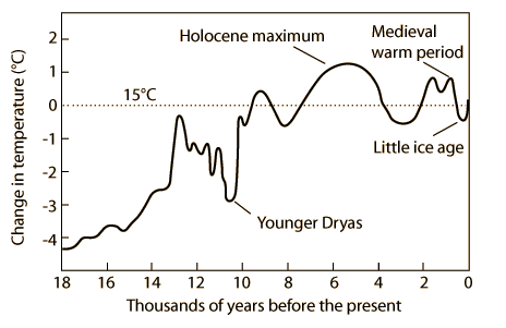 Global Temperature History![]() Temperature change since the industrial revolution The increase in temperature since about 1850 that convinces us that global warming is taking place shows a global temperature increase between 0.5 and 1°C. For perspective, it is important to compare that to longer term temperature models. ![]() This approximate timeline for global temperature is modeled after Marshak. It can provide some context of the range of global temperatures through the warm and cold periods of the past several thousand years.