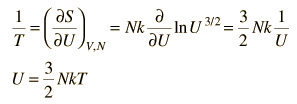 This definition implies that you are holding both the volume and the number of particles constant in taking the derivative. This can be applied to the expression for the entropy of a monoatomic ideal gas: ![]() Taking the partial derivative of this with respect to U to get the temperature requires some gymnastics with the logarithms. Using the rules for the logarithms of products allows us to express the logarithm as just ln(U3/2) plus some other log terms which do not contain U and therefore will drop out when the derivative is taken. Then remember that ln(U)3/2=3/2ln(U) and that the derivative of ln(U) is just 1/U. This finally gives us: ![]() This relationship for the internal energy is just that which is obtained from equipartition of energy. Since the internal energy of a monoatomic gas is just the translational kinetic energy of the molecules, this is in agreement with the kinetic temperature mentioned above, so the two definitions of temperature are equivalent for this case. |