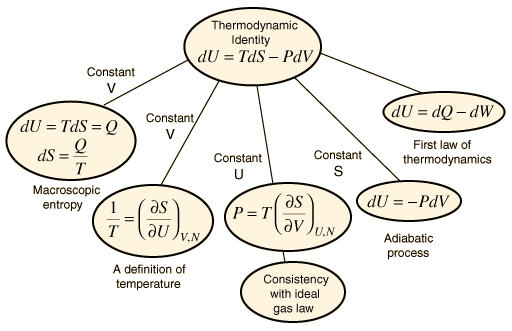 The Thermodynamic IdentityA useful summary relationship called the thermodynamic identity makes use of the power of calculus and particularly partial derivatives. It may be applied to examine processes in which one or more state variables is held constant, e.g., constant volume, constant pressure, etc. The thermodynamic identity holds true for any infinitesmal change in a system so long at the pressure and temperature are well defined. It is presumed that the number of particles is constant (i.e., you are dealing with the same system before and after the change).