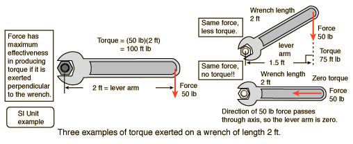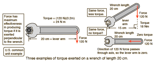 TorqueA torque is an influence which tends to change the rotational motion of an object. One way to quantify a torque is Torque = Force applied x lever armThe lever arm is defined as the perpendicular distance from the axis of rotation to the line of action of the force.