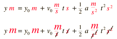 For example, in the solution for distance in constant acceleration motion, the distance is set equal to an expression involving combinations of distance, time, velocity and acceleration. But the combination of the units in each of the terms must yield just the unit of distance, since the left hand side of the equation has the dimension of distance.