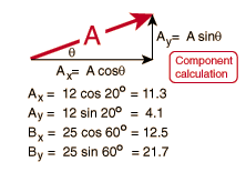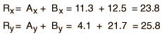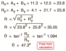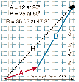The process can be done mathematically by finding the components of A and B, combining to form the components of R, and then converting to polar form.