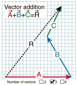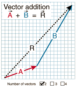 Adding two vectors A and B graphically can be visualized like two successive walks, with the vector sum being the vector distance from the beginning to the end point. Representing the vectors by arrows drawn to scale, the beginning of vector B is placed at the end of vector A. The vector sum R can be drawn as the vector from the beginning to the end point.