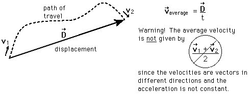 Average Velocity, GeneralThe average speed of an object is defined as the distance traveled divided by the time elapsed. Velocity is a vector quantity, and average velocity can be defined as the displacement divided by the time. For general cases involving non-constant acceleration, this definition must be applied directly because the straight line average velocity expressions do not work.![]() If the positions of the initial and final points are known, then the distance relationship can be used to find the displacement. |