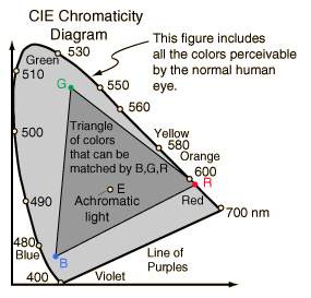 The colors which can be matched by combining a given set of three primary colors (such as the blue, green,a nd red of a color television screen) are represented on the chromaticity diagram by a triangle joining the coordinates for the three colors.