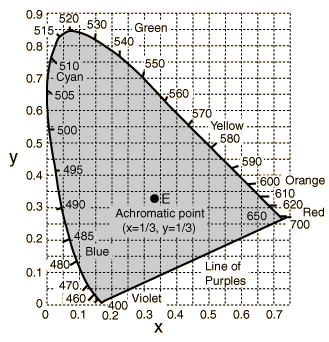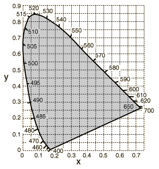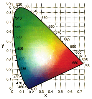 The diagram at left represents the the mapping of human color perception in terms of two CIE parameters x and y. The spectral colors are distributed around the edge of the "color space" as shown, and that outline includes all of the perceived hues and provides a framework for investigating color.