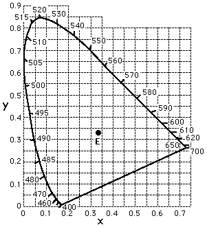 Calculation of CIE Chromaticity CoordinatesThe calculation of the CIE chromaticity coordinates for a given colored object requires the multiplication of its spectral power at each wavelength times the weighting factor from each of the three color matching functions. Summing these contributions gives three values called the tristimulus values, from which the chromaticity coordinates are derived.